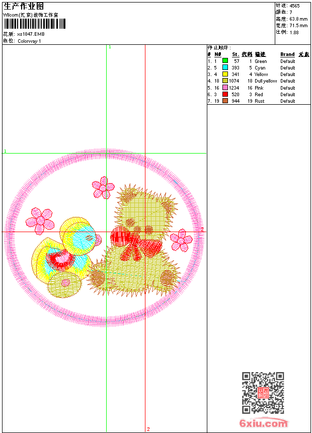 - emb花版参数: 大小:48.50 KB / 尺寸:71*64[毫米] / 针数:4565针 / 线色:7 / 格式:emb / 版本:9