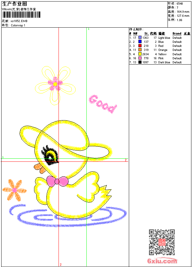 - emb花版参数: 大小:60.50 KB / 尺寸:128*165[毫米] / 针数:6543针 / 线色:7 / 格式:emb / 版本:9