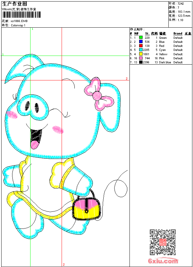 - emb花版参数: 大小:74.00 KB / 尺寸:124*183[毫米] / 针数:7242针 / 线色:7 / 格式:emb / 版本:9