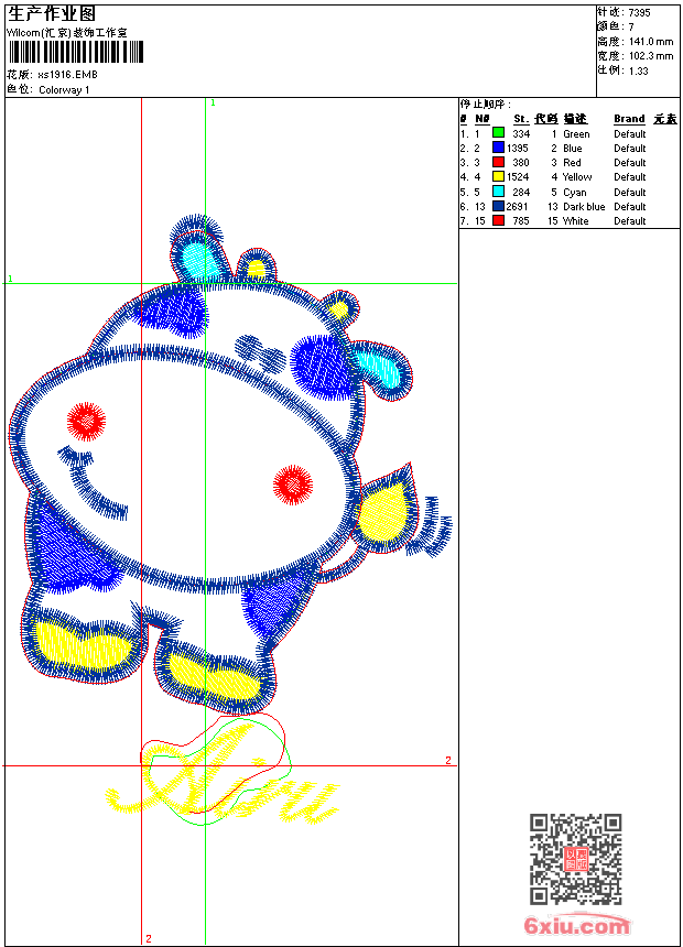 - emb花版参数: 大小:64.00 KB / 尺寸:102*141[毫米] / 针数:7395针 / 线色:7 / 格式:emb / 版本:9