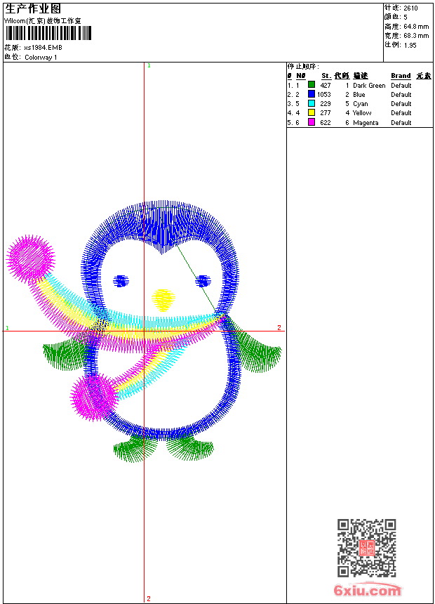 - emb花版参数: 大小:31.50 KB / 尺寸:68*65[毫米] / 针数:2611针 / 线色:5 / 格式:emb / 版本:9