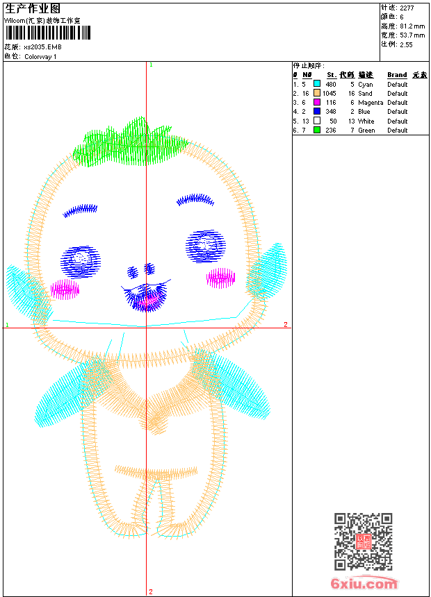 - emb花版参数: 大小:35.50 KB / 尺寸:54*81[毫米] / 针数:2277针 / 线色:6 / 格式:emb / 版本:9