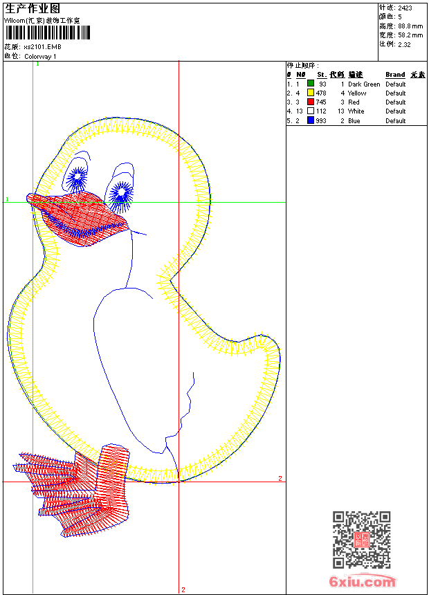 - emb花版参数: 大小:35.00 KB / 尺寸:58*89[毫米] / 针数:2423针 / 线色:5 / 格式:emb / 版本:9