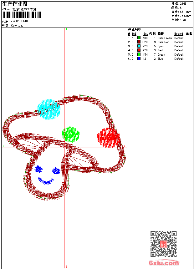 - emb花版参数: 大小:32.00 KB / 尺寸:76*65[毫米] / 针数:2148针 / 线色:6 / 格式:emb / 版本:9