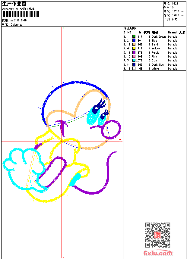 - emb花版参数: 大小:80.00 KB / 尺寸:177*187[毫米] / 针数:9321针 / 线色:9 / 格式:emb / 版本:9