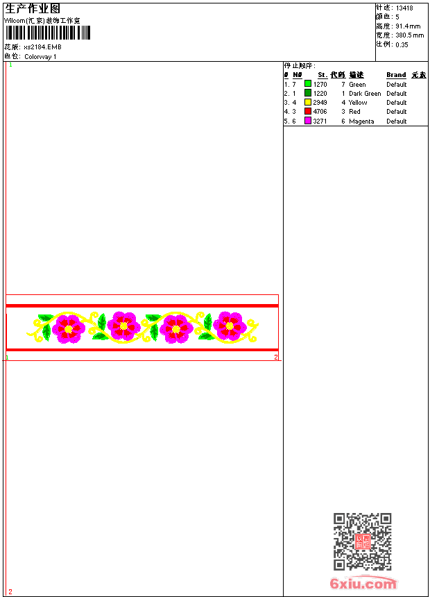 - emb花版参数: 大小:56.50 KB / 尺寸:381*91[毫米] / 针数:13418针 / 线色:5 / 格式:emb / 版本:9