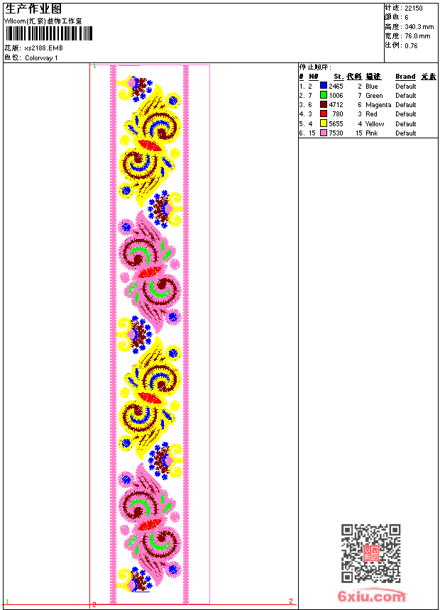 - emb花版参数: 大小:98.00 KB / 尺寸:76*340[毫米] / 针数:22150针 / 线色:6 / 格式:emb / 版本:9