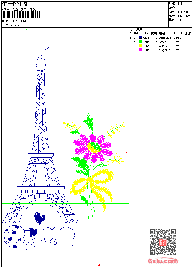 - emb花版参数: 大小:40.00 KB / 尺寸:143*236[毫米] / 针数:6393针 / 线色:4 / 格式:emb / 版本:9