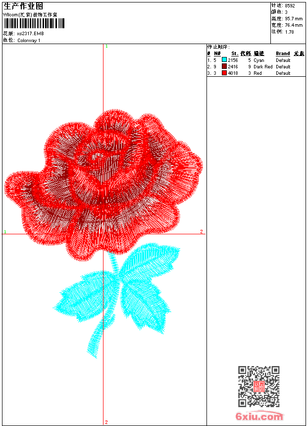- emb花版参数: 大小:50.50 KB / 尺寸:76*96[毫米] / 针数:8597针 / 线色:3 / 格式:emb / 版本:9