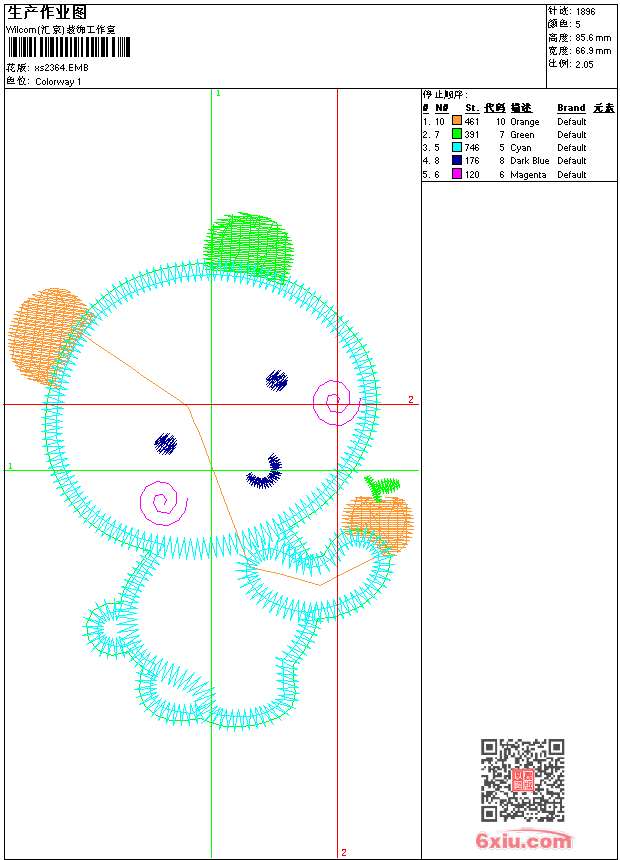 - emb花版参数: 大小:35.00 KB / 尺寸:67*86[毫米] / 针数:1896针 / 线色:5 / 格式:emb / 版本:9