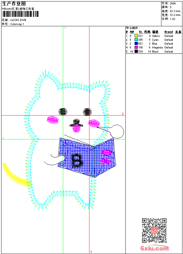 - emb花版参数: 大小:29.50 KB / 尺寸:72*83[毫米] / 针数:2006针 / 线色:5 / 格式:emb / 版本:9