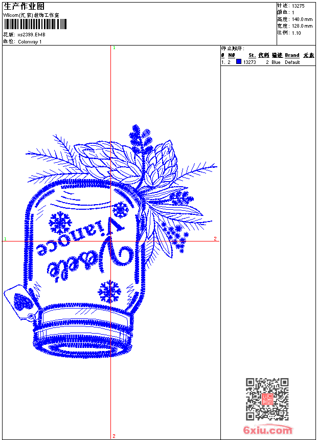 - emb花版参数: 大小:80.00 KB / 尺寸:128*140[毫米] / 针数:13280针 / 线色:1 / 格式:emb / 版本:9