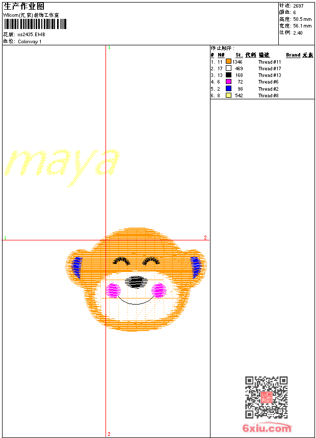 - emb花版参数: 大小:30.00 KB / 尺寸:56*51[毫米] / 针数:2698针 / 线色:6 / 格式:emb / 版本:9