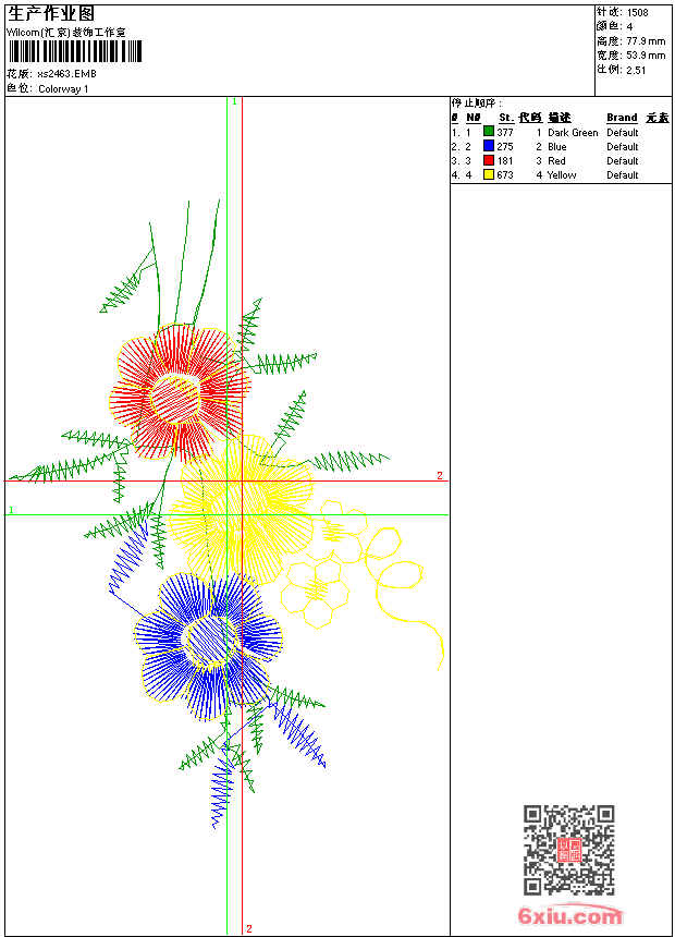 - emb花版参数: 大小:26.50 KB / 尺寸:54*78[毫米] / 针数:1508针 / 线色:4 / 格式:emb / 版本:9
