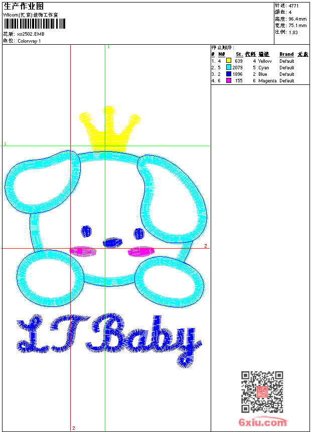 - emb花版参数: 大小:44.00 KB / 尺寸:75*96[毫米] / 针数:4771针 / 线色:4 / 格式:emb / 版本:9