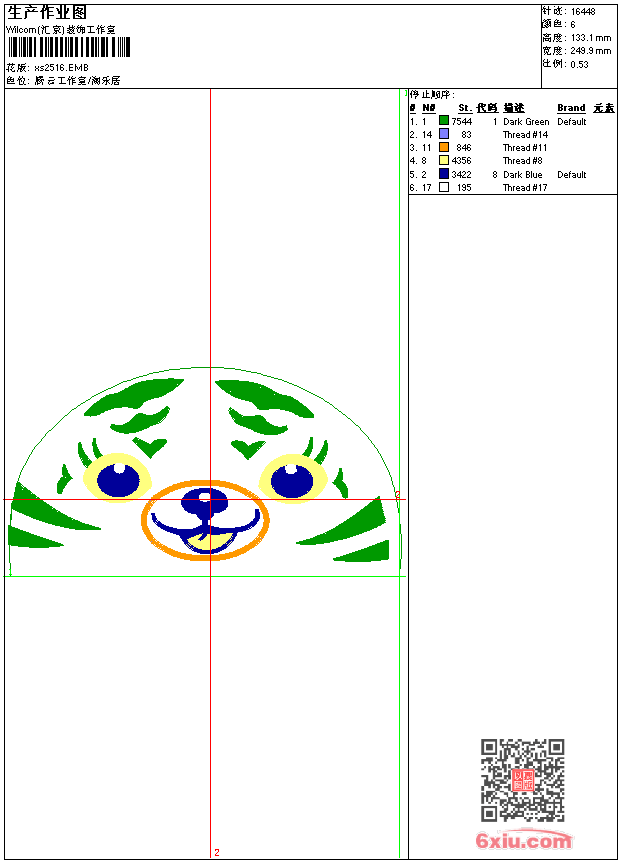 - emb花版参数: 大小:73.00 KB / 尺寸:250*133[毫米] / 针数:16448针 / 线色:6 / 格式:emb / 版本:9