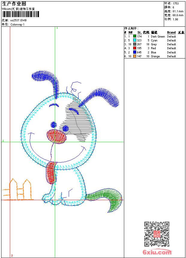 - emb花版参数: 大小:32.50 KB / 尺寸:69*81[毫米] / 针数:1753针 / 线色:6 / 格式:emb / 版本:9