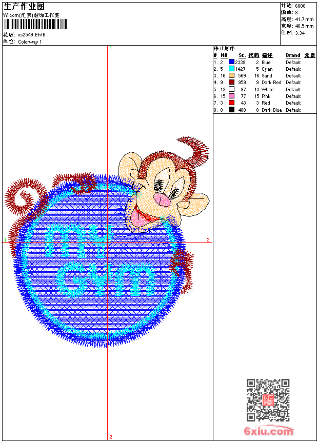 - emb花版参数: 大小:49.00 KB / 尺寸:41*42[毫米] / 针数:5999针 / 线色:8 / 格式:emb / 版本:9