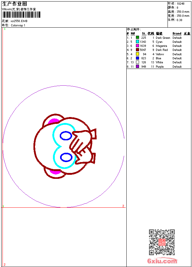 - emb花版参数: 大小:63.50 KB / 尺寸:350*350[毫米] / 针数:10248针 / 线色:8 / 格式:emb / 版本:9