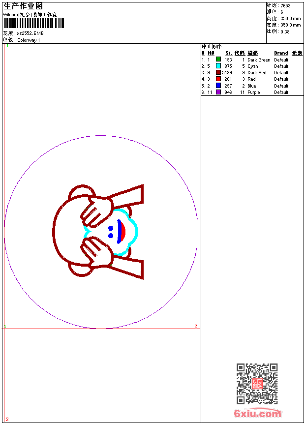 - emb花版参数: 大小:50.50 KB / 尺寸:350*350[毫米] / 针数:7653针 / 线色:6 / 格式:emb / 版本:9
