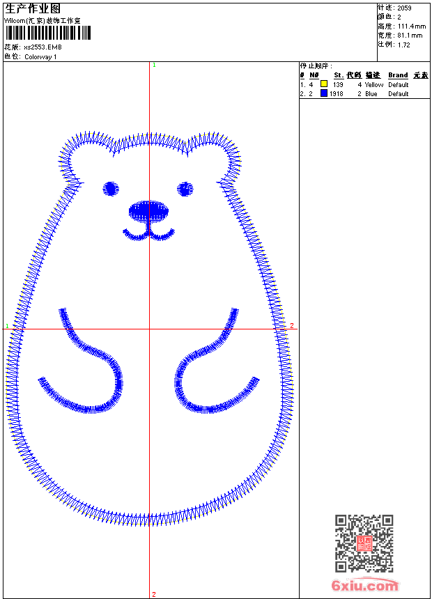 - emb花版参数: 大小:29.50 KB / 尺寸:81*111[毫米] / 针数:2059针 / 线色:2 / 格式:emb / 版本:9
