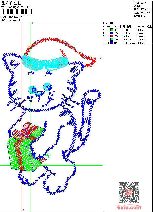 - emb花版参数: 大小:58.50 KB / 尺寸:86*138[毫米] / 针数:6070针 / 线色:5 / 格式:emb / 版本:9