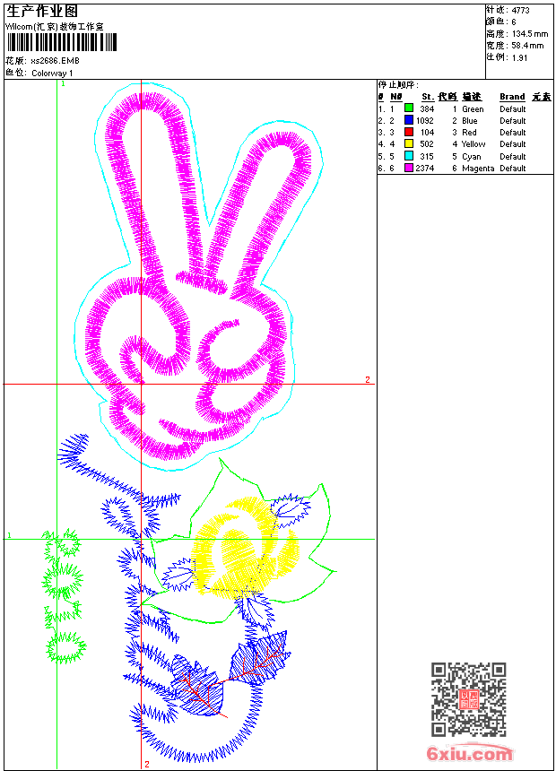 - emb花版参数: 大小:40.00 KB / 尺寸:58*135[毫米] / 针数:4773针 / 线色:6 / 格式:emb / 版本:9