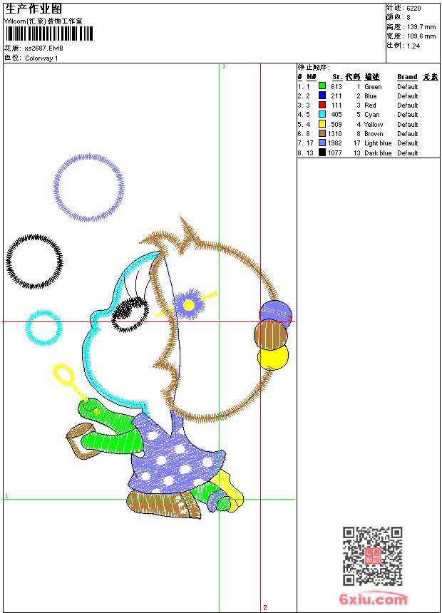 - emb花版参数: 大小:61.00 KB / 尺寸:110*140[毫米] / 针数:6220针 / 线色:8 / 格式:emb / 版本:9
