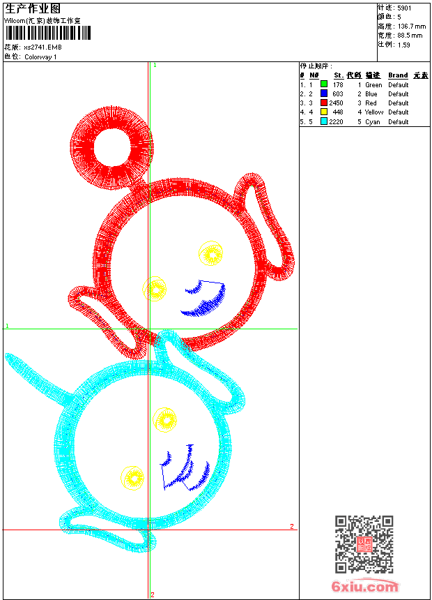 - emb花版参数: 大小:32.00 KB / 尺寸:89*137[毫米] / 针数:5901针 / 线色:5 / 格式:emb / 版本:9