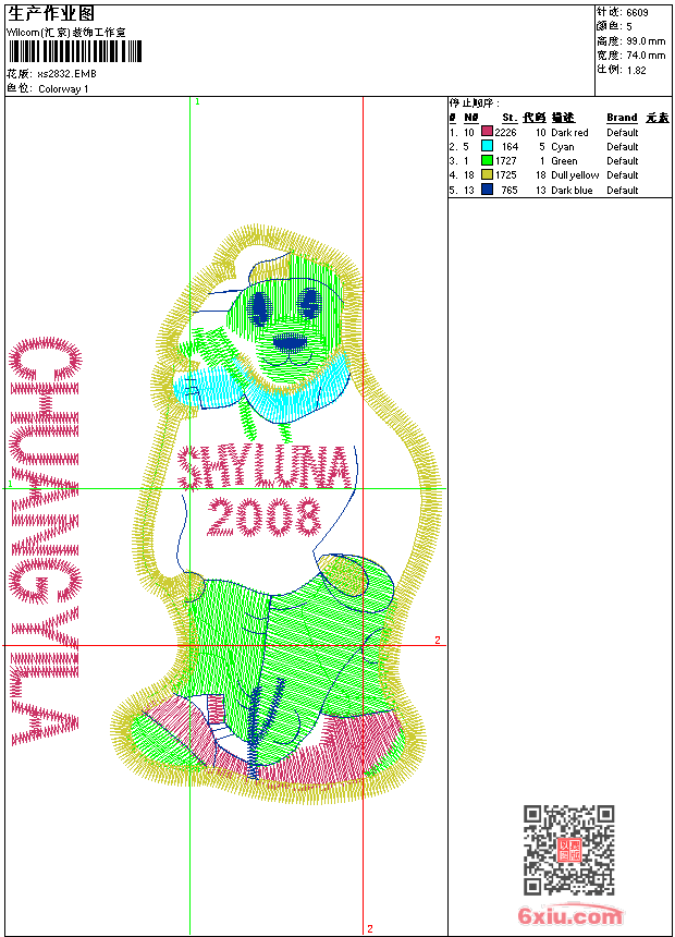 - emb花版参数: 大小:55.50 KB / 尺寸:74*99[毫米] / 针数:6613针 / 线色:5 / 格式:emb / 版本:9