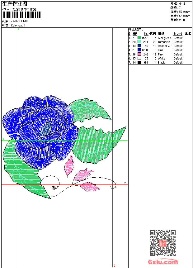 - emb花版参数: 大小:40.00 KB / 尺寸:65*54[毫米] / 针数:4419针 / 线色:7 / 格式:emb / 版本:9