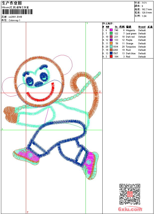 • 版带文件需绣花软件方可打开,可配色打印导出各种格式或直接上机绣。如无绣花软件可下载1:1模拟效果图。