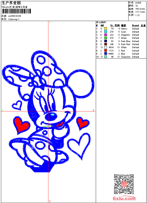 - emb花版参数: 大小:136.00 KB / 尺寸:118*156[毫米] / 针数:22432针 / 线色:10 / 格式:emb / 版本:9