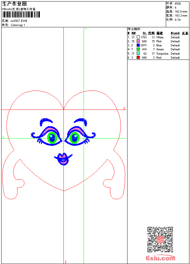 - emb花版参数: 大小:51.00 KB / 尺寸:183*162[毫米] / 针数:6526针 / 线色:6 / 格式:emb / 版本:9