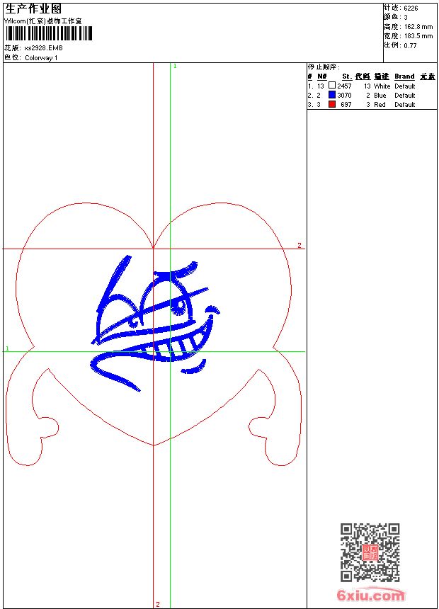 - emb花版参数: 大小:36.00 KB / 尺寸:184*163[毫米] / 针数:6226针 / 线色:3 / 格式:emb / 版本:9