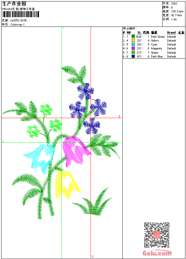 - emb花版参数: 大小:39.50 KB / 尺寸:93*120[毫米] / 针数:3263针 / 线色:6 / 格式:emb / 版本:9