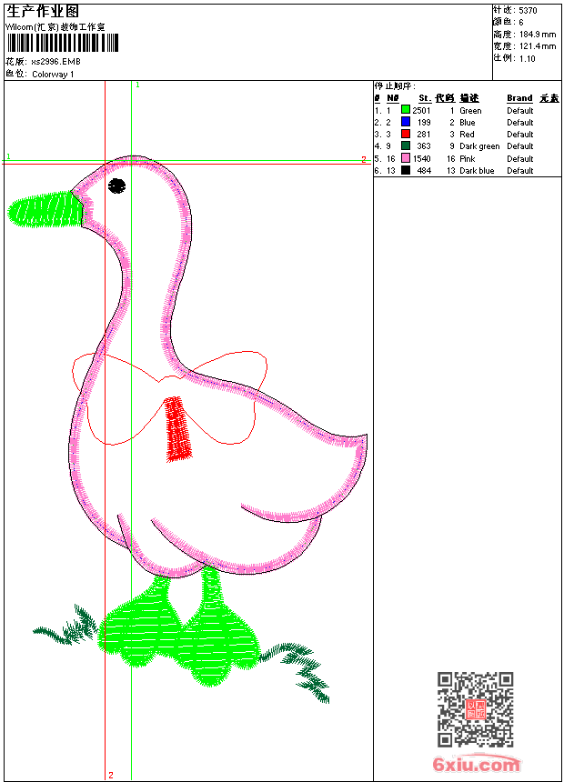 - emb花版参数: 大小:50.00 KB / 尺寸:121*185[毫米] / 针数:5370针 / 线色:6 / 格式:emb / 版本:9