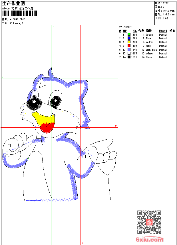 - emb花版参数: 大小:55.00 KB / 尺寸:131*154[毫米] / 针数:8222针 / 线色:7 / 格式:emb / 版本:9