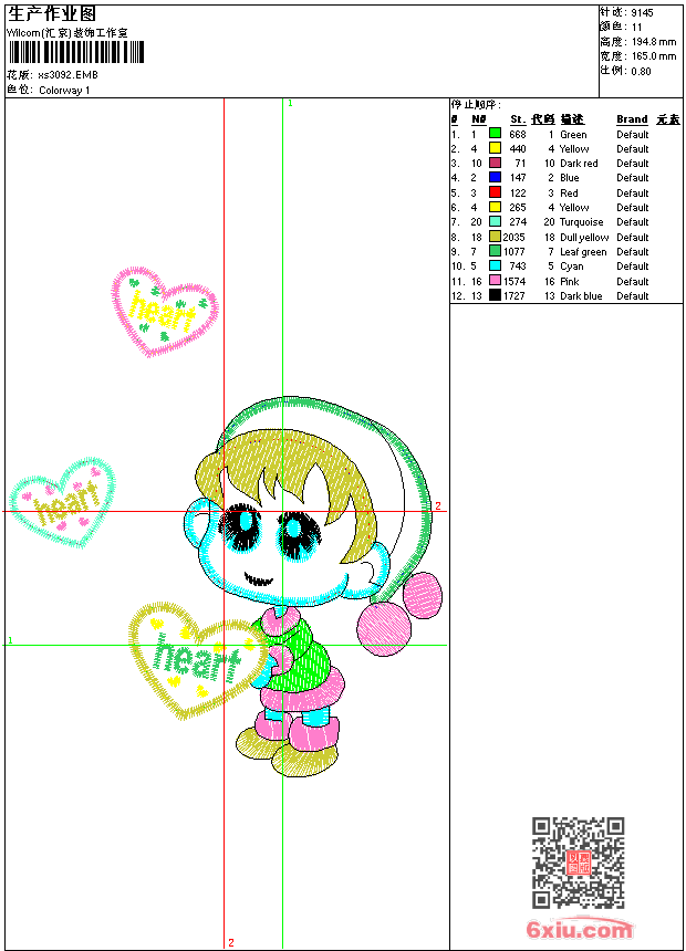 - emb花版参数: 大小:81.00 KB / 尺寸:165*195[毫米] / 针数:9142针 / 线色:11 / 格式:emb / 版本:9