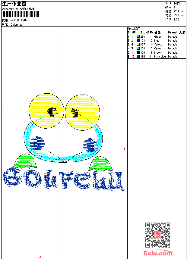 - emb花版参数: 大小:31.50 KB / 尺寸:60*48[毫米] / 针数:2485针 / 线色:6 / 格式:emb / 版本:9