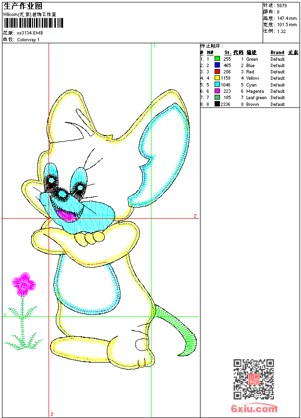 - emb花版参数: 大小:41.50 KB / 尺寸:102*147[毫米] / 针数:5879针 / 线色:8 / 格式:emb / 版本:9