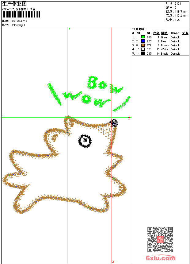- emb花版参数: 大小:46.00 KB / 尺寸:110*119[毫米] / 针数:3331针 / 线色:5 / 格式:emb / 版本:9