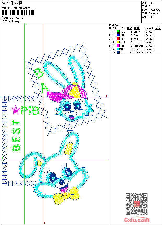 - emb花版参数: 大小:68.50 KB / 尺寸:90*140[毫米] / 针数:6070针 / 线色:7 / 格式:emb / 版本:9