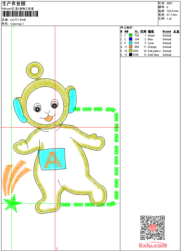 - emb花版参数: 大小:49.00 KB / 尺寸:92*120[毫米] / 针数:4958针 / 线色:6 / 格式:emb / 版本:9