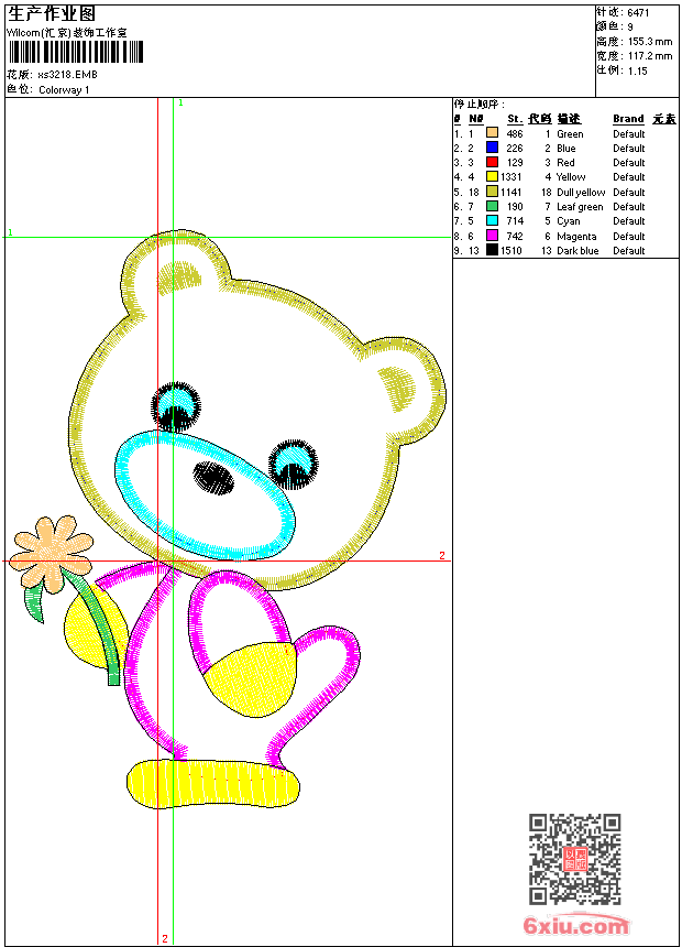 - emb花版参数: 大小:57.00 KB / 尺寸:117*155[毫米] / 针数:6471针 / 线色:9 / 格式:emb / 版本:9