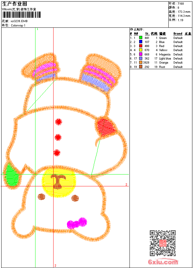 - emb花版参数: 大小:61.00 KB / 尺寸:114*173[毫米] / 针数:7168针 / 线色:8 / 格式:emb / 版本:9