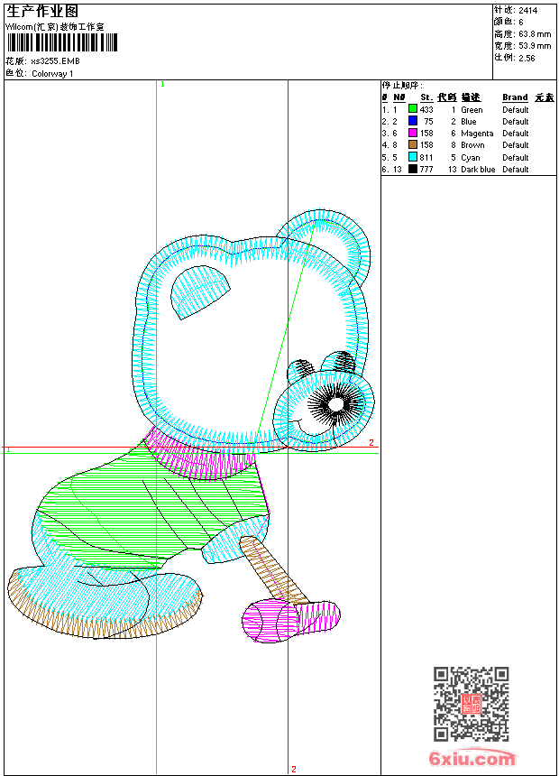 - emb花版参数: 大小:36.50 KB / 尺寸:54*64[毫米] / 针数:2414针 / 线色:6 / 格式:emb / 版本:9
