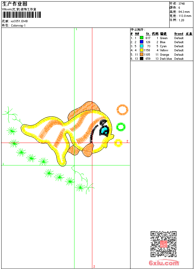 • emb花版参数: 大小:44.50 KB / 尺寸:114*84[毫米] / 针数:3740针 / 线色:6 / 格式:emb / 版本:9