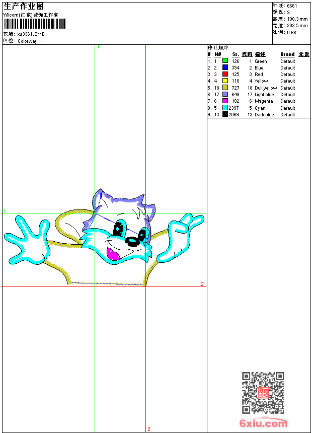 - emb花版参数: 大小:66.00 KB / 尺寸:203*100[毫米] / 针数:6661针 / 线色:9 / 格式:emb / 版本:9