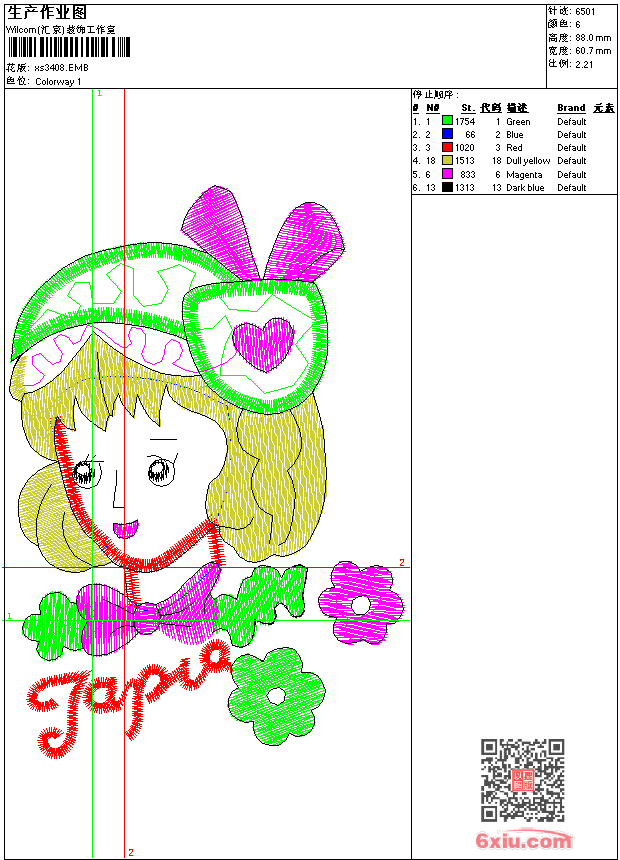 - emb花版参数: 大小:56.50 KB / 尺寸:61*88[毫米] / 针数:6501针 / 线色:6 / 格式:emb / 版本:9